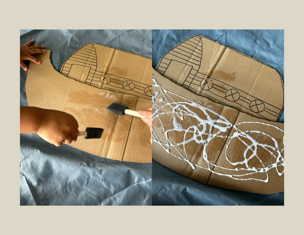 If you’d like to work a bit more on gross motor skills, I suggest squeezing some glue into a bowl and allowing your child to spread the glue on the cardboard boat by using sponge brushes (you can purchase those at Dollar Tree).