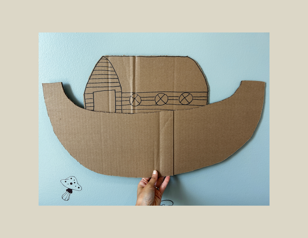 Simply take a big box, as big as you can find. I cut my big box to create two panels. On one panel, I drew the body of the boat. On the second panel, I drew the top part. Please note my incredible artistic ability below. 🤣 If you lack artistic confidence, these photos should make you feel a bit more able. These do not have to be perfect.