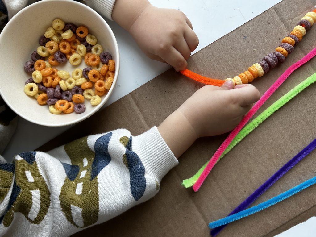 If you have an older toddler, you could increase the challenge by creating a color pattern with fruity, colored O’s. And if you trust your toddler to keep beads out of their mouth, you could also let them thread big beads instead of cereal.